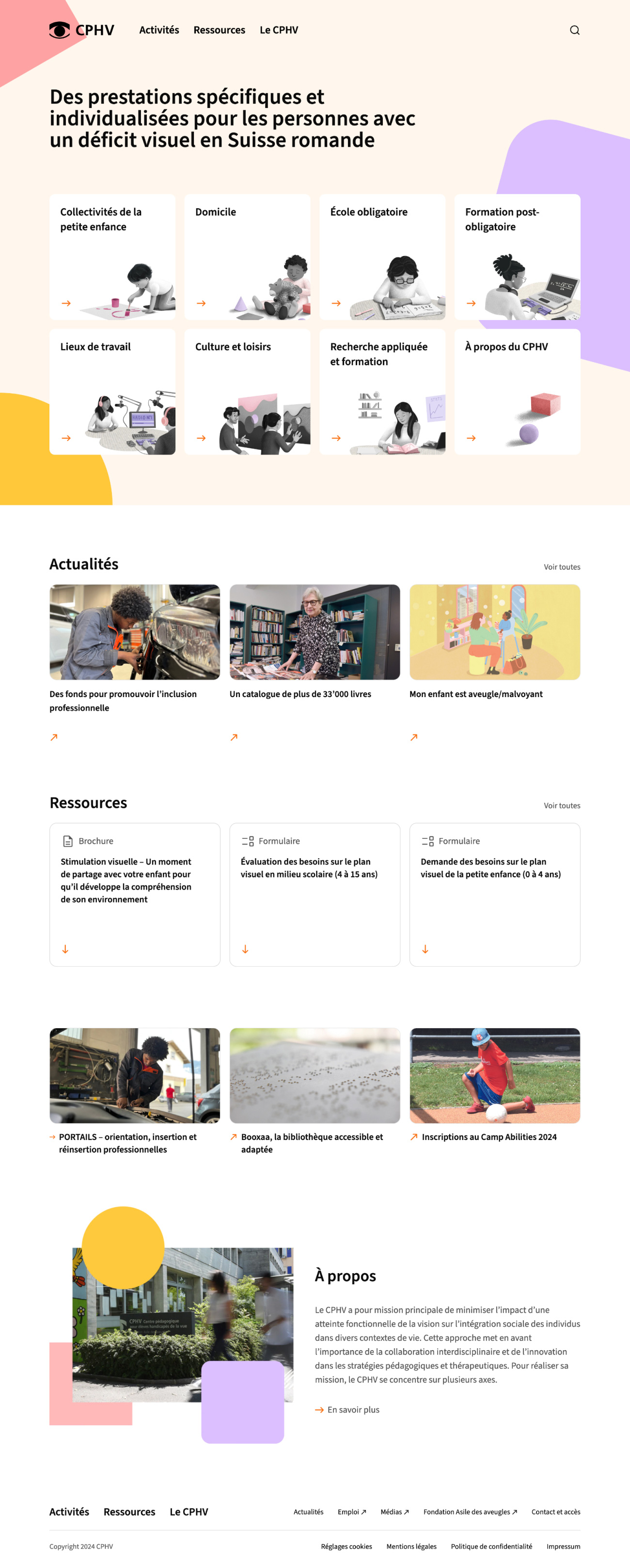 Après validation du prototype, nous avons conçu des interfaces accessibles, assurant une navigation adaptée à tous les visiteurs. Parallèlement, nous avons élaboré une ligne visuelle en collaboration avec le CPHV, la Fondation Asile des Aveugles et la société Cartoonbase pour les illustrations, donnant ainsi au site une identité visuelle cohérente et impactante. Enfin, après validation du design, nous avons développé le site sur mesure pour répondre parfaitement aux besoins des utilisateurs et du CPHV.